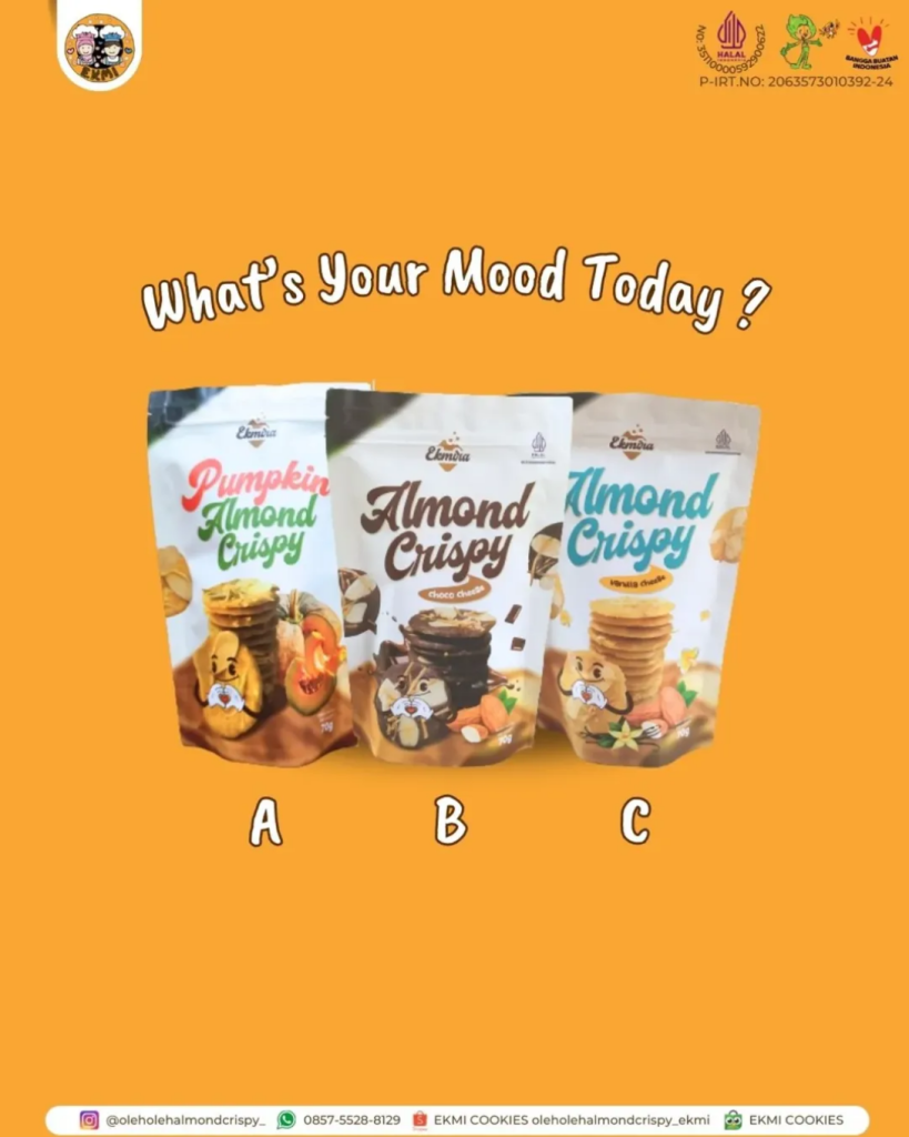 Almond Crispy Ekmira hadir dalam berbagai rasa: original, coklat, keju, green tea, dan red velvet. Setiap varian punya keunikan sendiri. Mau yang manis, gurih, atau segar? Semuanya ada! Coba semua dan temukan favoritmu...